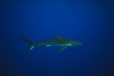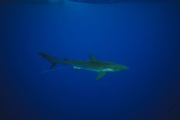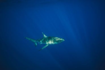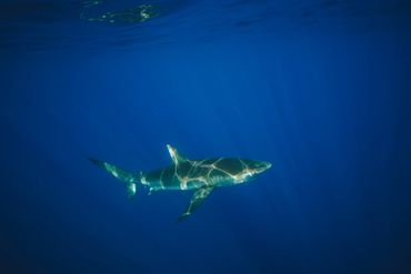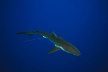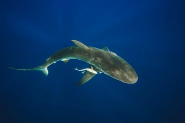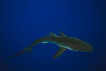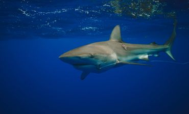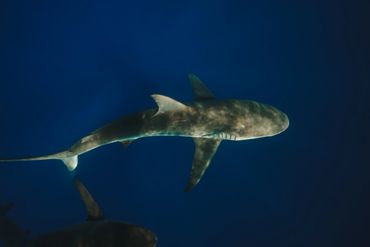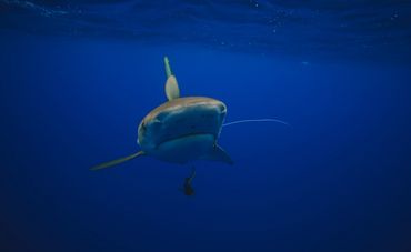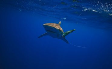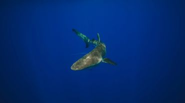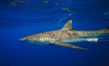 A shark swimming in deep blue water with a device attached.