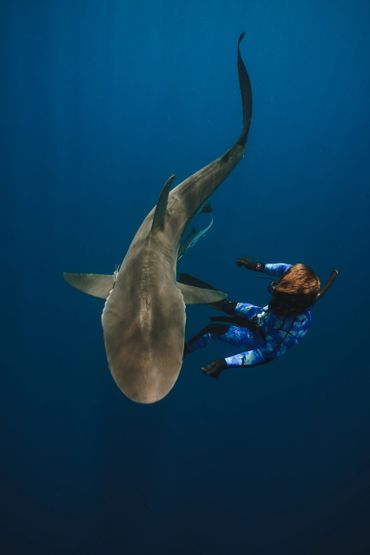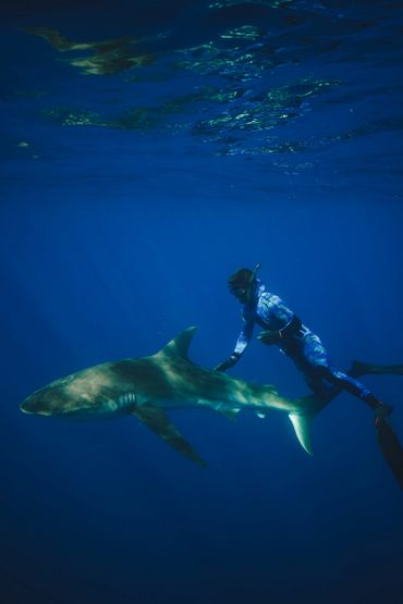 A diver reaches out to a shark underwater with more sharks nearby.